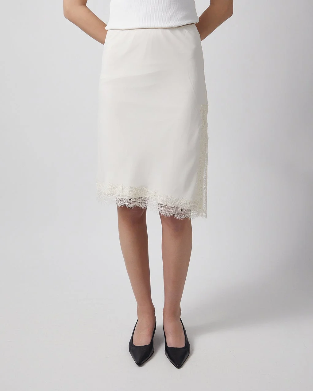 Skirt Lace Offwhite from Rohe. A refined skirt crafted from pure silk with delicate lace detailing along the hem for an elegant finish. Cut on the bias, it drapes fluidly and moves with ease. An elevated piece that transitions effortlessly from daytime looks to occasion dressing. Size and Fit - Fits true to size, choose your usual size - The model is 172 cm tall and is wearing size 36 Specification - Article number - ID: 178729-011 - Brand: Rohe - Color: Offwhite - Washing Instructions: Dry clean only - Made of: 100% Silk