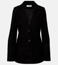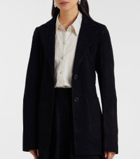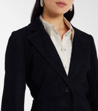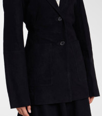 Rohe favors a multifaceted approach to design, infusing every collection with elements of Dutch art and architecture. This style combines the gentle softness of suede with the structured tailoring of a blazer into a refined silhouette for everyday styling. Product Details - Material: 100% goat leather (suede) - Care instructions: specialist clean - Made in India - Designer color name: Black - Item color: black - Lining: 100% viscose - Contains non-textile parts of animal origin - Notched lapel - Pockets: patch pockets - Closure: single-breasted (two buttons) - Item number: P01103206 Size & Fit - True to size - Cinched waist - Non-stretchy fabric - Falls below the hip - The model seen in the picture is 178cm-5'10" and wearing a size FR 34