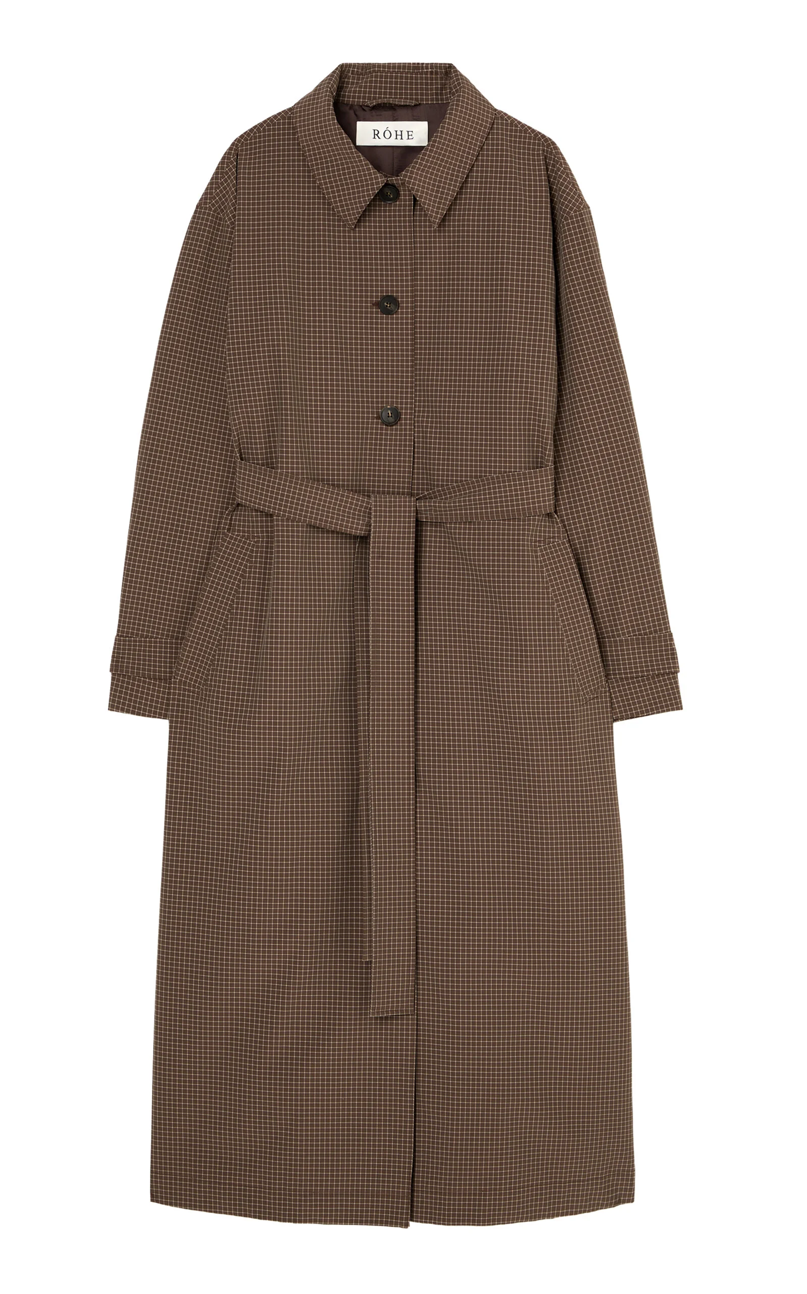 Amsterdam-based atelier Rohe offers exceptionally crafted staples in pair-with-anything neutrals that are as well-constructed as they are timeless. A classic coat rendered in a subtle mini check, crafted from a technical fabric for everyday durability. Designed with a tie belt to define the waist, it features a structured collar, cuff straps, slanted pockets and a fully lined interior for comfort and ease. PRODUCT DETAILS - Spring '26 - Button fastening - Composition: 88% polyamide, 12% elastane - Dry clean - Imported