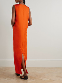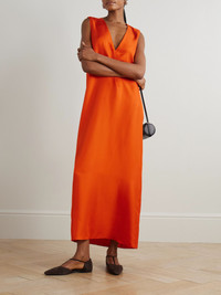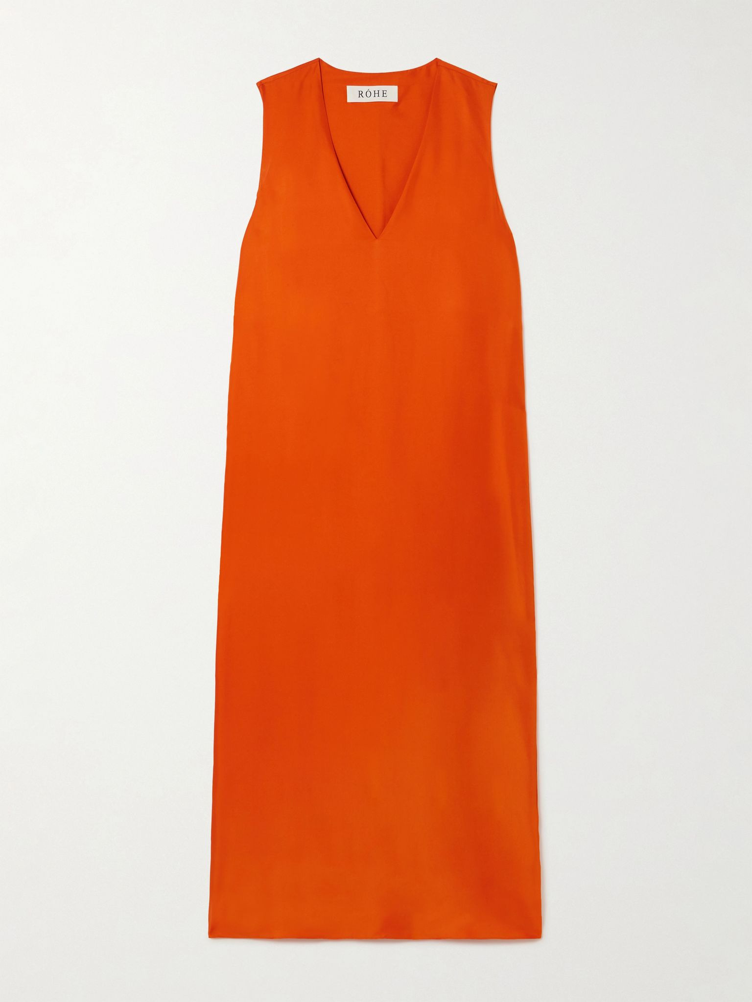 ROHE's modern, sculptural style is equal parts understated and striking. This dress is made from vibrant burnt-orange silk-satin that drapes beautifully for a loose fit and has a V-neckline. Size & Fit - Fits true to size, take your normal size - Designed for a relaxed fit - Mid-weight, non-stretchy fabric - Model is 180cm/ 5'11" and is wearing a FR 36 Model measurements: - Bust: 80cm/ 31.5" - Waist: 65cm/ 25.5" - Hip: 89cm/ 35" Details & Care - Burnt-orange silk-satin - Slips on - 100% silk