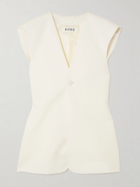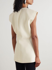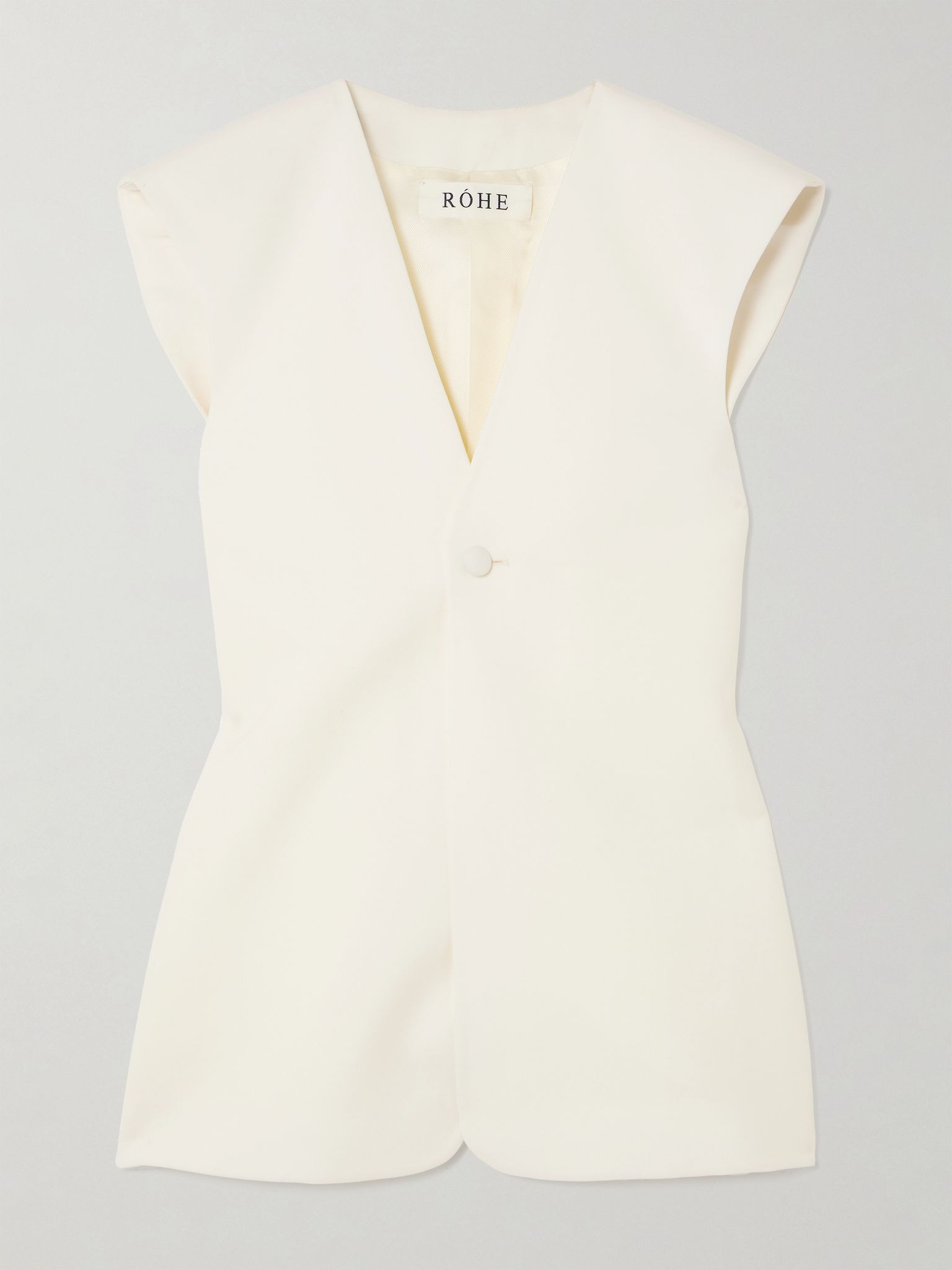 There's a sculptural artistry to ROHE's vest. It's tailored from wool in subtle but striking elongated proportions that curve through its length. Pair yours with wide-leg pants. Size & Fit - Fits true to size, take your normal size - Designed for a slim fit - Internal shoulder pads - Mid-weight, non-stretchy fabric - Model is 177cm/ 5'10" and is wearing a FR 36 Model measurements: - Bust: 77cm/ 30.5" - Waist: 62cm/ 24.5" - Hip: 88cm/ 34.5" Details & Care - Ivory wool - Button fastening at front - 100% wool