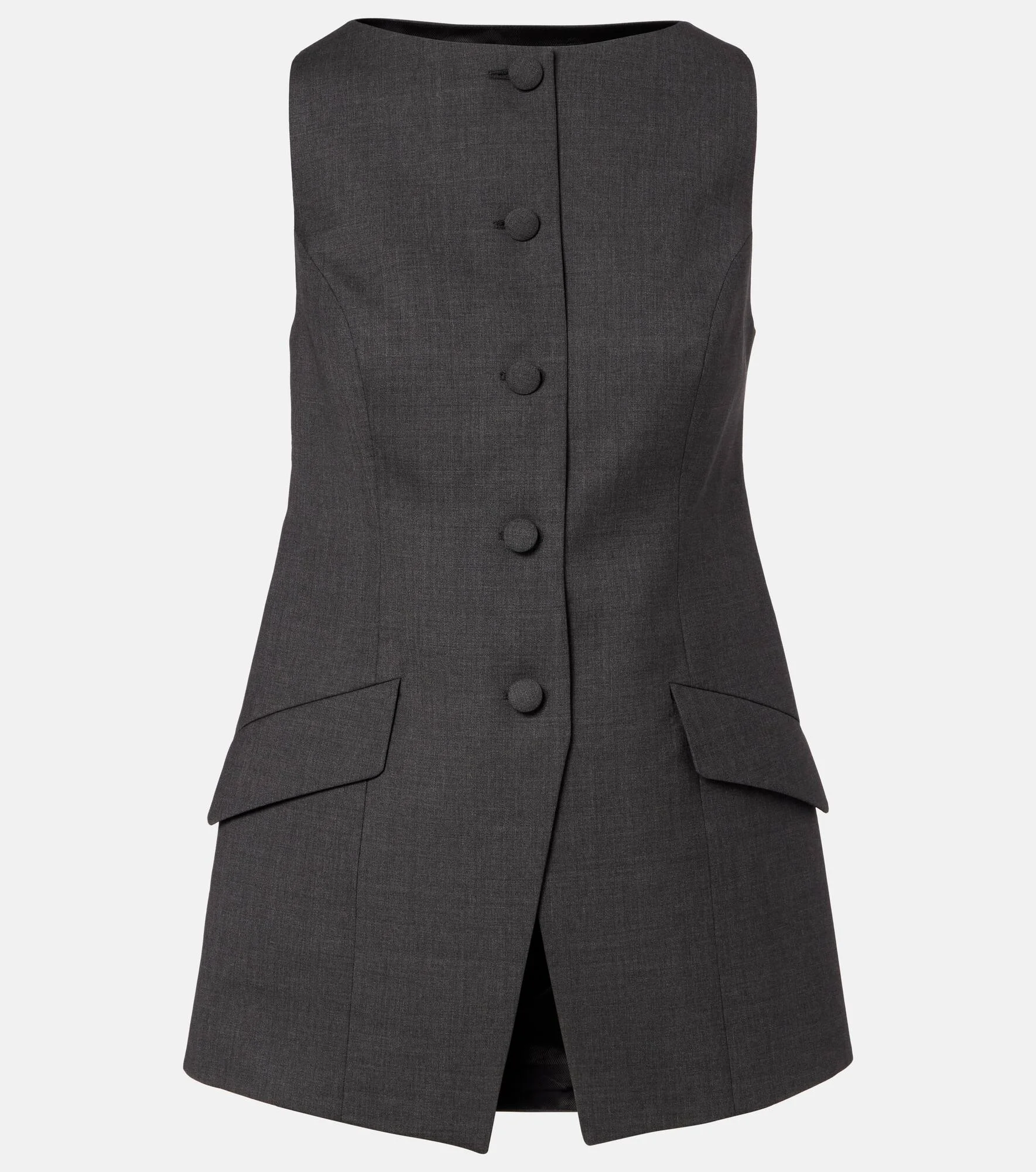Rohe creates minimalist staples that transcend trends and seasons, and this wool vest is no exception. The sleeveless piece features a tailored silhouette, flattering boat neckline, flap pockets, and a classic button-front closure. Product Details - Material: 98% wool, 2% elastane - Care instructions: dry clean - Made in Portugal - Designer color name: Dark Grey Melange - Item color: gray - Lining: 100% viscose - Closure: buttoned front - Pockets: flap pockets - Fully lined - Item number: P01103191 Size & Fit - True to size - Cinched waist - Non-stretchy fabric - Falls below the hip - The model seen in the picture is 178cm-5'10" and wearing a size FR 34