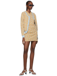 Knit viscose-blend skirt. · Rib knit elasticized waistband · Graphic pattern jacquard knit throughout Supplier color: Camel/ Blue emblem 70% viscose, 30% polyester. Made in Portugal 221151F090020