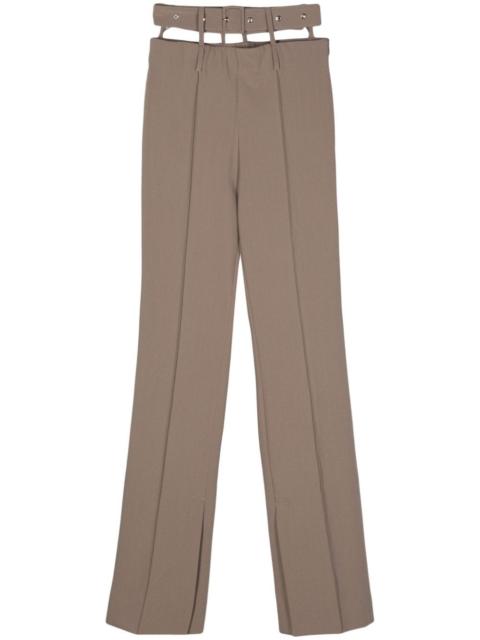 belt-detail straight trousers Highlights - Taupe brown - Stretch-design - Belted waist - Cut-out detailing - Belt loops - Raised seam detail - Straight leg - Short side slits - Two rear jetted pockets - Concealed side hook and zip fastening Imported Composition Polyester 80%, Viscose 16%, Spandex/Elastane 4% SIZE & FIT Measurement HIPS 35.43 in(90 cm) Outside Leg 45.27 in(115 cm) WAIST 29.13 in(74 cm)