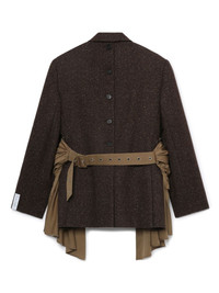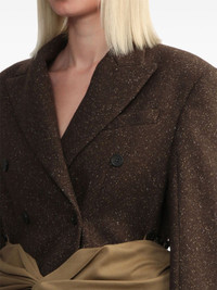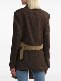 belted blazer Highlights - Coffee brown - Wool blend - Twill weave - Speckled effect - Detachable and adjustable draped waist belt - Buckle fastening - Double-breasted button fastening - Wide peak lapels - Shoulder pads - Long sleeves - Buttoned cuffs - Chest welt pocket - English rear vents - Draped panel detail Imported Composition Wool 76%, Nylon 24% Washing instructions Read Manufacturer Guidelines