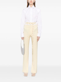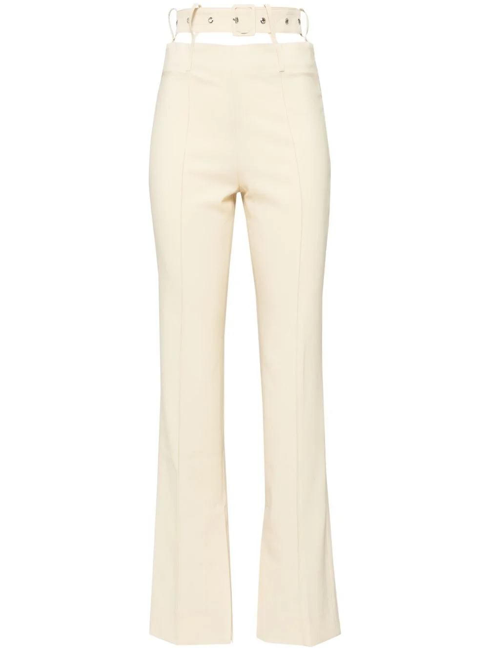 belted flared trousers Highlights - Light yellow - Logo patch to the rear - Exposed-seam detailing - High-rise - Belt loops - Detachable and adjustable waist belt - Flared design - Concealed front fastening - Concealed side zip fastening - Two rear jetted pockets Imported Composition Polyester 80%, Viscose 16%, Spandex/Elastane 4% SIZE & FIT Model measurements Height 5 ft 10 in(1.77 m) Bust/Chest 30.7 in(78 cm) Hips 35.03 in(89 cm) Waist 23.62 in(60 cm) FittingInformation Designed with a flared hem, these trousers allow for a close fit at the waist with a slim fit over the leg and widening towards the hem The belt offers adjustability for fitted preferences Made from a midweight stretch fabric, this piece offers elasticity and flexibility when worn This piece fits true to size – take your usual size