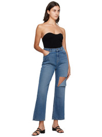 Relaxed-fit non-stretch denim jeans. Fading and distressing throughout. · Belt loops · Five-pocket styling · Zip-fly · Cutout at knee · Logo patch at back waistband · Logo flag at back · Logo-engraved silver-tone hardware · Contrast stitching in tan Supplier color: Deep blue