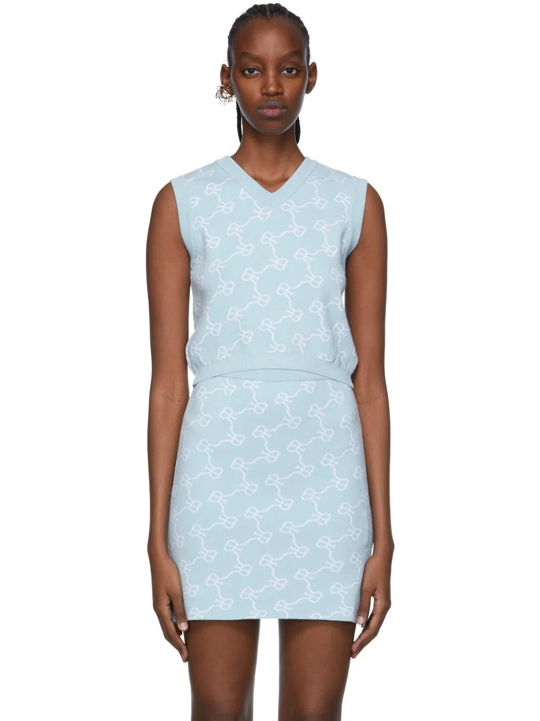 Knit viscose-blend vest. · Rib knit V-neck, armscyes, and hem · Jacquard knit graphic pattern throughout Supplier color: Blue/White emblem 70% viscose, 30% polyester. Made in Portugal 221151F068001