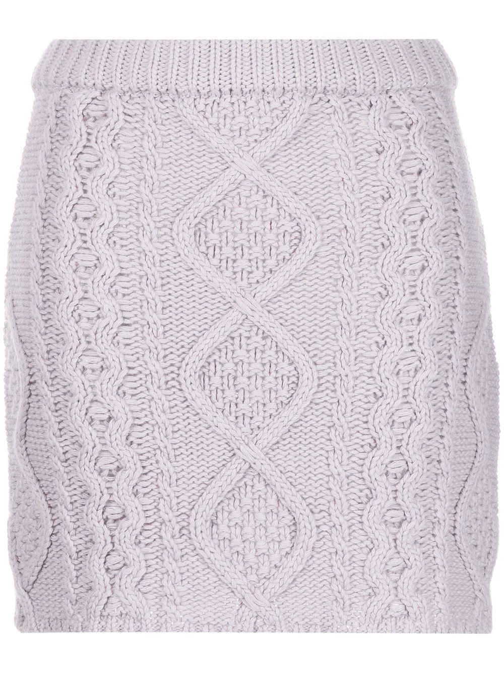 cable-knit mid-ride skirt Highlights - Lavender purple - Cable knit - Ribbed-knit edge - Slip-on style - Thigh-length Imported Composition Body: Wool 35%, Viscose 30% Nylon 35% SIZE & FIT Model measurements Height 5 ft 11 in(1.8 m) Bust/Chest 28.34 in(72 cm) Hips 35.43 in(90 cm) Waist 23.62 in(60 cm) FittingInformation This piece fits true to size. We recommend you get your regular size Cut for a slim fit Made with a mid-weight fabric