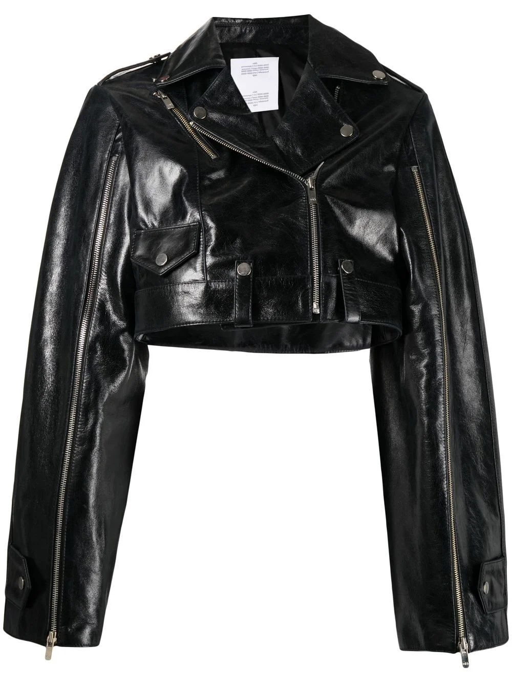 cropped leather biker jacket black calf leather off-centre front zip fastening wide peak lapels belted waist front stud-fastening pocket extra-long sleeves cropped Imported Composition Calf Leather 100% SIZE & FIT Model measurements Height 5 ft 11 in(1.8 m) Bust/Chest 28.34 in(72 cm) Hips 35.43 in(90 cm) Waist 23.62 in(60 cm) FittingInformation This piece fits true to size. We recommend you get your regular size Cut for a loose fit Made from supple hide Washing instructions Dry Clean Only