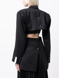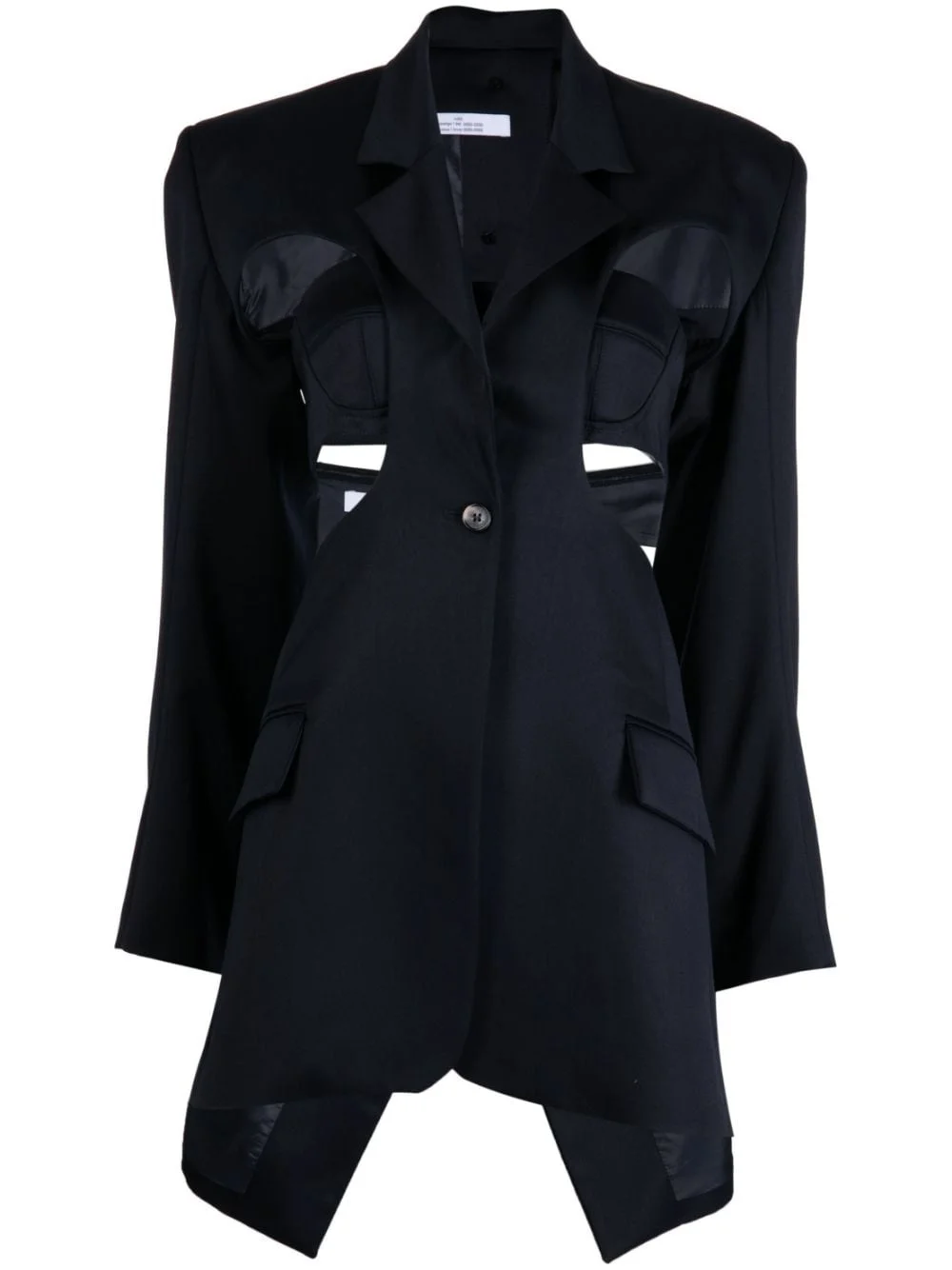 cut-out single-breasted blazer Highlights - Black - Linen blend - Cut-out detailing - Notched lapels - Two front flap pockets - Shoulder pads - Front button fastening - Long sleeves - Buttoned-cuff sleeves - Rear button fastening - Open back - Straight hem Imported Composition Body: Linen/Flax 50%, Polyester 50% Lining: Polyester 100% SIZE & FIT Model measurements Height 5 ft 10 in(1.77 m) Bust/Chest 31.88 in(81 cm) Hips 33.85 in(86 cm) Waist 24.01 in(61 cm) FittingInformation Designed for a close fit at the chest and waist with a loose fit at the hip Made from a midweight non-stretch fabric This piece fits large – take one size down Washing instructions Dry Clean Only