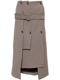houndstooth belted midi skirt Highlights - Brown - Houndstooth pattern - Decorative button detailing - Mid-rise - Belted waist - Panelled design - Asymmetric hem - Central rear vent - Full lining Imported Composition Lining: Viscose 48%, Polyester 42% Outer: Polyester 61%, Viscose 35%, Spandex/Elastane 4% SIZE & FIT Model measurements Height 5 ft 9 in(1.76 m) Bust/Chest 31.1 in(79 cm) Hips 35.03 in(89 cm) Waist 24.4 in(62 cm) FittingInformation Designed with an asymmetric hem, this skirt is intended to be worn just below the waist The vented hem offers movement at the rear Made from a midweight stretch fabric, this piece offers elasticity and flexibility when worn This piece fits true to size – take your usual size