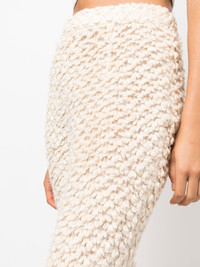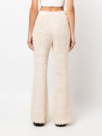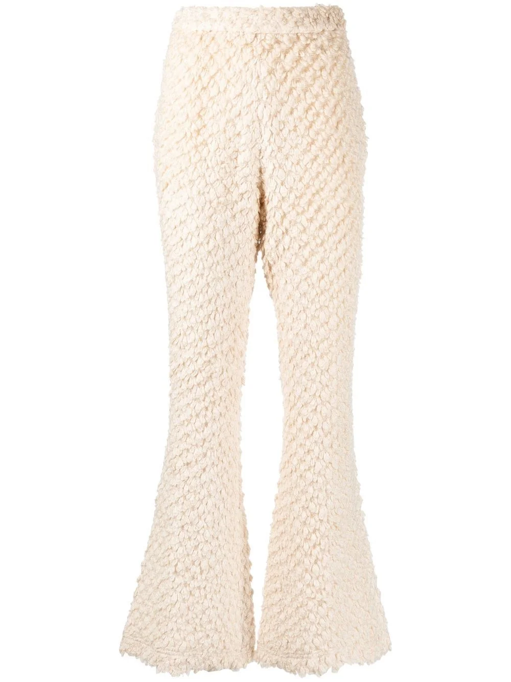 knit flare lounge trousers ivory white chunky knit boucle design flared mid-rise Imported Composition Polyester 80%, Wool 20% SIZE & FIT Model measurements Height 5 ft 11 in(1.8 m) Bust/Chest 31.49 in(80 cm) Hips 35.43 in(90 cm) Waist 24.4 in(62 cm) FittingInformation This piece fits true to size. We recommend you get your regular size Designed to be fitted at the waist and through the thigh, loose from the knee Made with a mid-weight non-stretch fabric