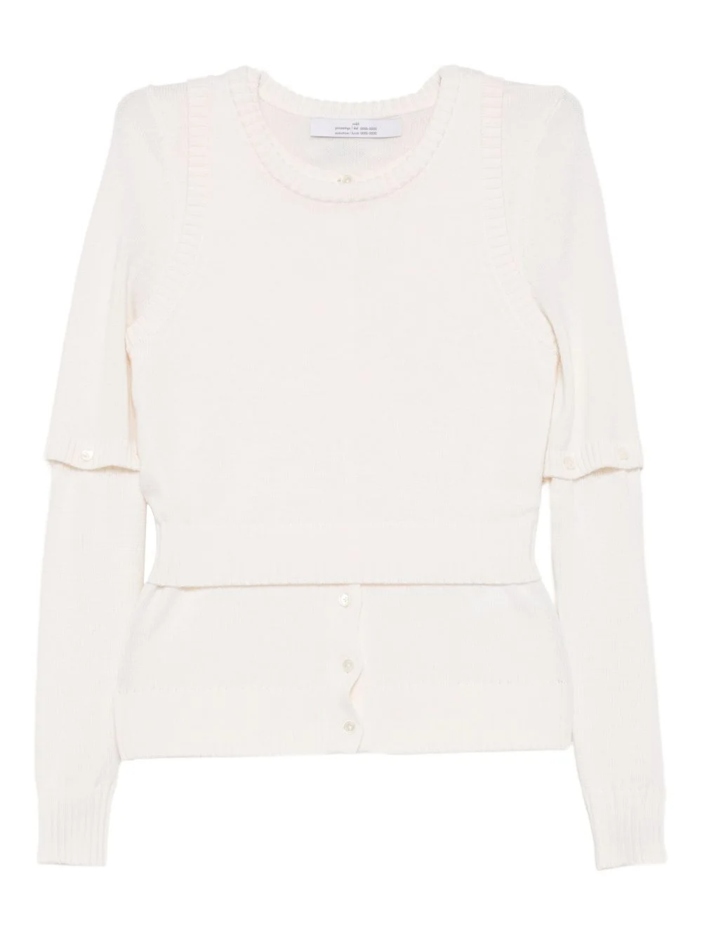 layered cardigan top Highlights - Off-white - Crew neck - Detachable cardigan - Ribbed cuffs and hem Imported Composition Merino 100% SIZE & FIT FittingInformation Designed for a slim fit that sits just away from the body offering a close yet comfortable fit Made with a midweight knit, this piece offers some stretch Washing instructions Dry Clean Only