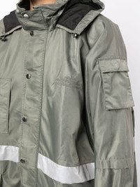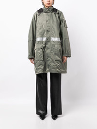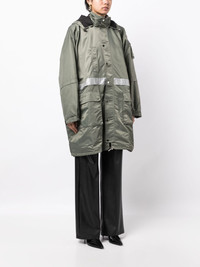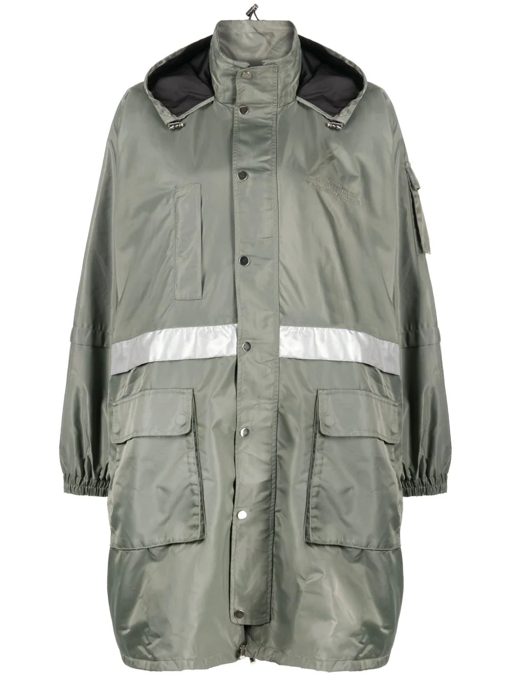 multi-pocket hooded parka coat Highlights - Olive green/silver-tone - Drawstring hood - Front press-stud and zip fastening - Long sleeves - Elasticated cuffs - Chest welt pocket - Sleeve flap pocket - Two front flap pockets - Straight hem - Above-knee length Imported Composition Body: Polyamide 100% SIZE & FIT Model measurements Height 5 ft 10 in(1.77 m) Bust/Chest 31.49 in(80 cm) Hips 35.43 in(90 cm) Waist 25.19 in(64 cm) FittingInformation Designed for an oversized fit, offering additional room throughout The internal drawstring at the hem allows for fitted preferences Made from a midweight non-stretch fabric This piece fits true to size – if you would prefer a closer fit, take one size down