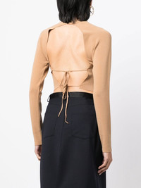 open-back cropped knitted jumper brown fine knit high neck long raglan sleeves open back self-tie fastening cropped Imported Composition Viscose 70%, Polyester 30% SIZE & FIT Model measurements Height 5 ft 10 in(1.77 m) Bust/Chest 31.49 in(80 cm) Hips 35.43 in(90 cm) Waist 25.19 in(64 cm) FittingInformation This piece fits true to size. We recommend you get your regular size Cut for a close fit Made with a mid-weight fabric