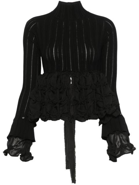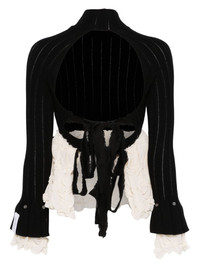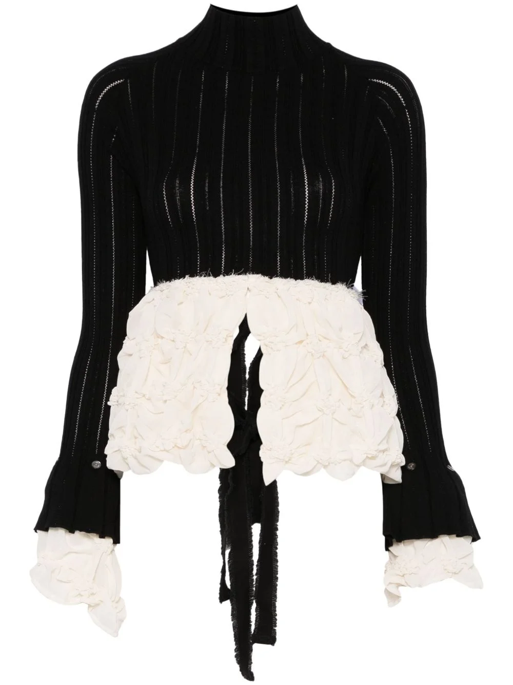 open-back top Highlights - Black - High neck - Long sleeves - Detachable cuffs - Ruffled detailing Imported Composition Viscose 78%, Polyester 22%