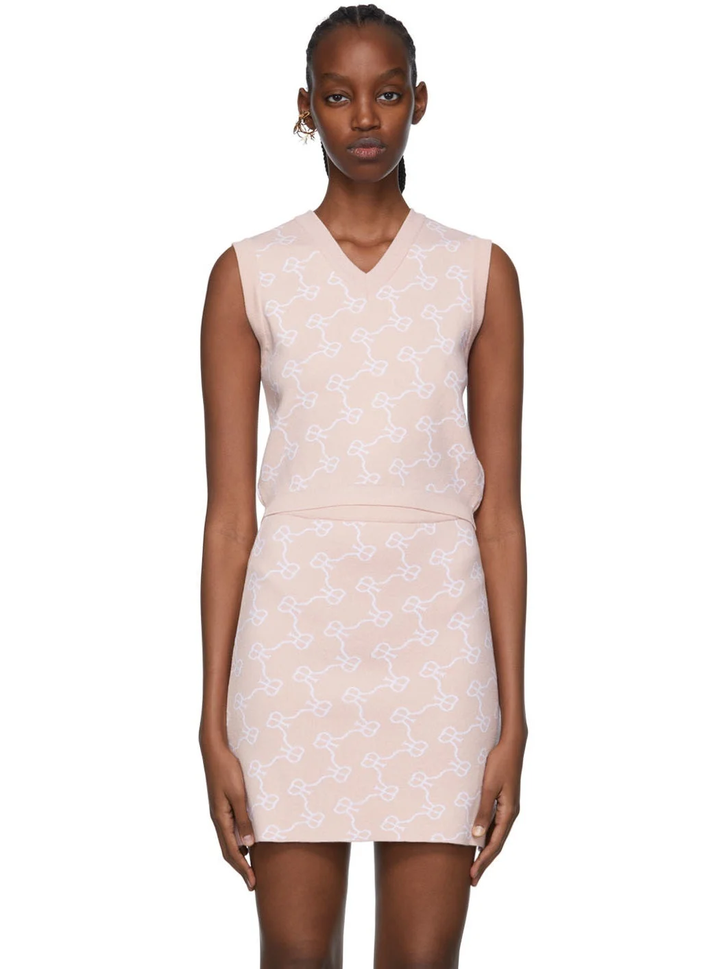 Knit viscose-blend vest. · Rib knit V-neck, armscyes, and hem · Jacquard knit graphic pattern throughout Supplier color: Light pink/White emblem 70% viscose, 30% polyester. Made in Portugal 221151F068002