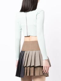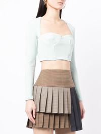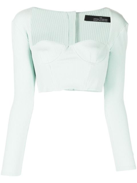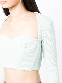 ribbed sweetheart-neck top pale blue ribbed knit sweetheart neck cropped exposed rear zip fastening long sleeves straight hem Imported Composition Polyester 67%, Rayon 33% SIZE & FIT Model measurements Height 5 ft 10 in(1.78 m) Bust/Chest 30.31 in(77 cm) Hips 34.64 in(88 cm) Waist 25.59 in(65 cm) FittingInformation This piece fits true to size. We recommend you get your regular size Cut for a slim fit Made with a mid-weight stretch fabric Washing instructions Hand Wash
