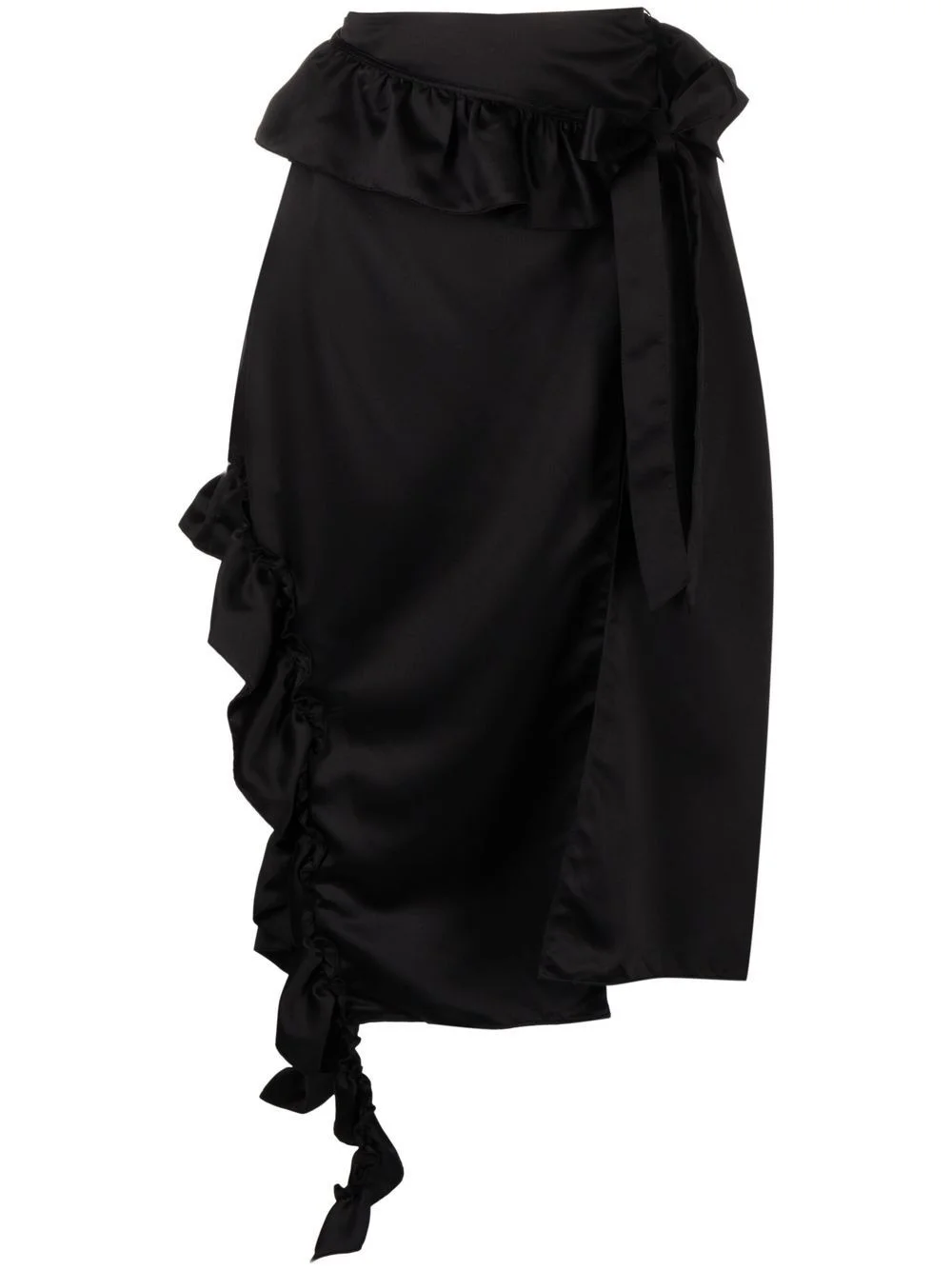 ruffle-trim midi skirt black satin finish ruffled detailing high waist side tie fastening side slit Imported Composition Body: Polyester 100% SIZE & FIT Model measurements Height 5 ft 10 in(1.77 m) Bust/Chest 31.49 in(80 cm) Hips 35.43 in(90 cm) Waist 25.19 in(64 cm) FittingInformation This piece fits true to size. We recommend you get your regular size Designed for a loose fit with a close fit at the waist Made with a lightweight non-stretch fabric