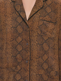 Rokh blouser in brown, all-over snake print, curved notch lapels, front button placket, patch breast pocket, hand pockets, split sleeves with string tie, straight/finished hem, tonal stitching. Made in the United Kingdom. Composition - 100% Silk Model is 5ft 8” and wearing a size 38. Bust: 32” Waist: 26” Hip: 36"