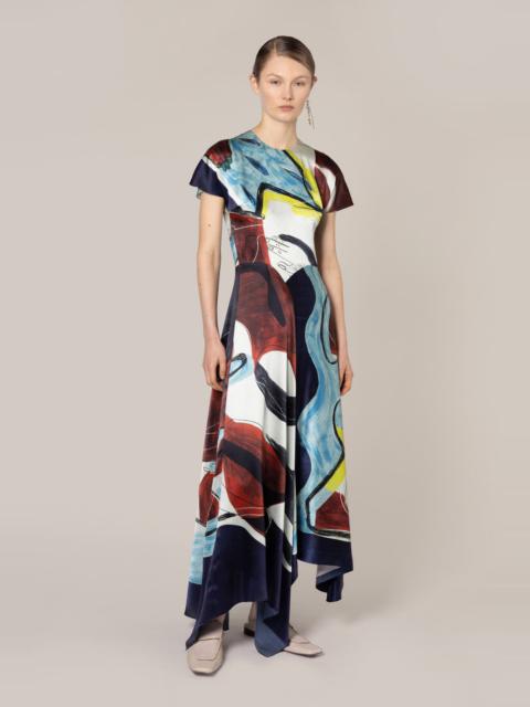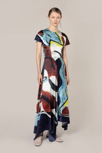 The ADRIANA dress features an abstract print of bold brushstrokes in rich reds, blues, yellows, and greens. The fluid silhouette, with flutter sleeves and an asymmetrical hem, is a staple Roksanda design, offering effortless elegance and movement. DETAILS & CARE Main Colour: River Multi Product Composition: Silk Product Care: Specialist Dry Clean SIZING & FIT Model Wears: Size 8 Sizing System: UK Sizing