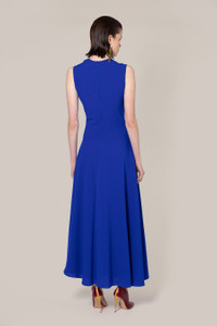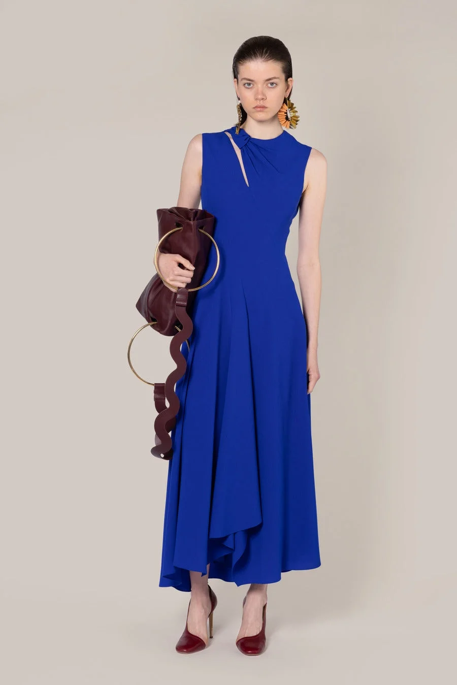 The ALMA dress features a fitted bodice that flows into a fluid, full skirt, creating an elegant silhouette. A delicate knot detail at the neckline adds a subtle yet refined touch to this striking, minimalist design. DETAILS & CARE Main Colour: Marine Product Composition: Crepe Product Care: Specialist Dry Clean SIZING & FIT Model Wears: Size 8 Sizing System: UK Sizing