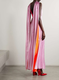 EDITORS'NOTES Roksanda's stunning designs really showcase her use of color and shape. Part of the Spring '24 collection, this 'Amanita' gown is crafted from lustrous silk-satin and has a twist-front neckline and cape-effect panels that show off a flash of bold orange as you walk. Wear yours with equally vibrant shoes and a tote. SIZE & FIT - Fits true to size, take your normal size - Intended to be fitted at the bust and waist, slightly loose at the hip - Lightweight, fluid, non-stretchy fabric - Model is 180cm/ 5’11” and is wearing a UK 8 DETAILS & CARE - Baby-pink and bright-orange silk-satin - Concealed hook and zip fastening at back - 100% silk; lining: 66% viscose, 34% silk - Specialist clean - Designer color: Blush Pink/ Tangerine
