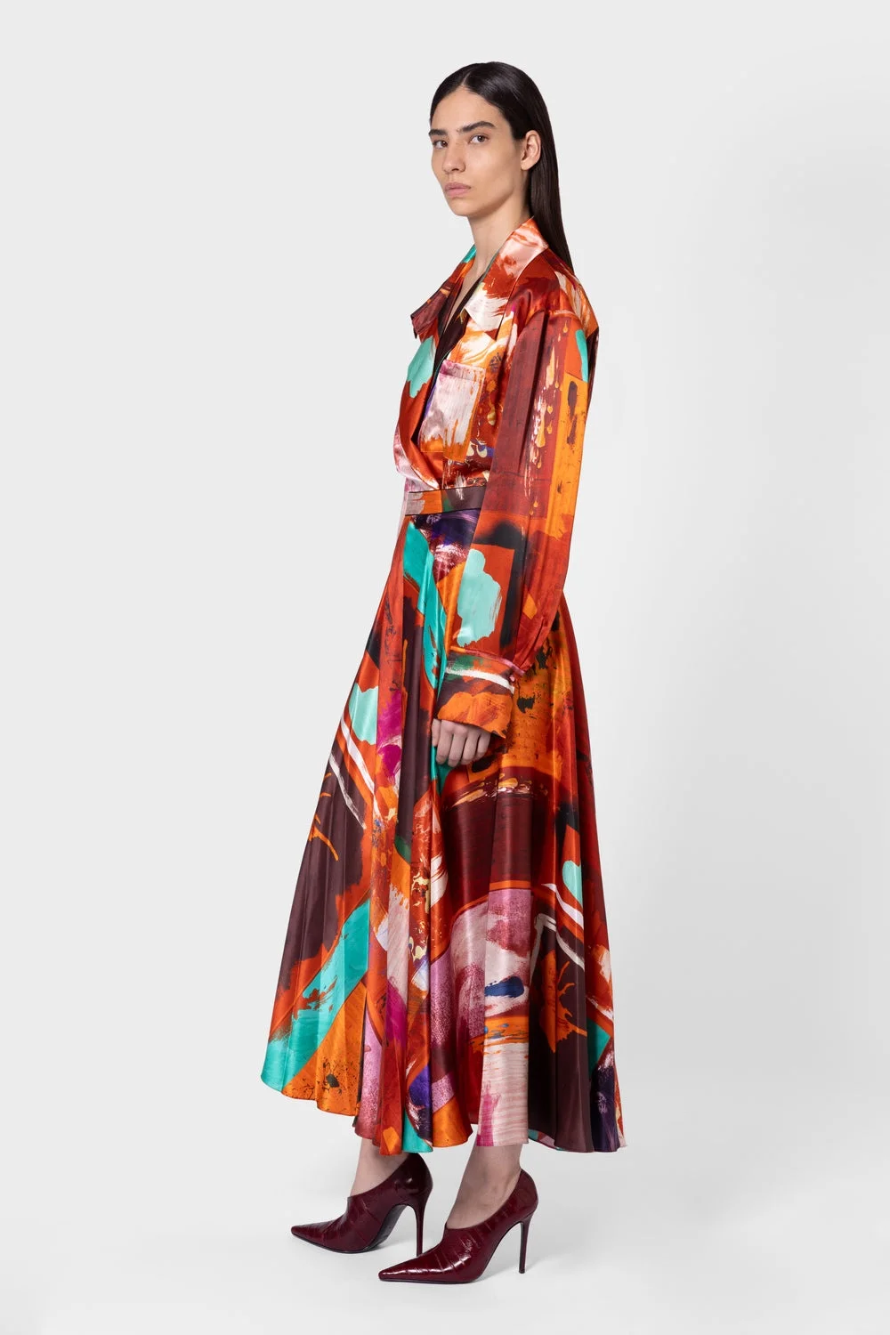 The AMEERA skirt features a vibrant abstract print in hues of orange, red, and a pop of aqua blue, offering a bold, artistic statement. This high-waisted circle skirt enhances the fluid movement of the fabric, creating a dynamic, elegant and flattering look. DETAILS & CARE Main Colour: Blood Orange Pictorial Print Product Fabric: Silk Satin Product Composition: 100% Silk Product Care: Specialist Dry Clean SIZING & FIT Model Wears: Size 8 Sizing System: UK Sizing