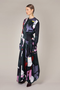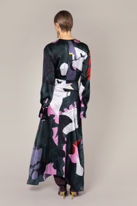 The ASTRID dress features an abstract print in deep greens, reds, purples, and pinks, creating a bold and artistic visual effect. The long cuffed sleeves and flowing skirt with an asymmetrical hem offer a fluid, elegant silhouette, while the tailored waist enhances the structure. DETAILS & CARE Main Colour: Peacock Product Composition: Silk Product Care: Specialist Dry Clean SIZING & FIT Model Wears: Size 8 Sizing System: UK Sizing