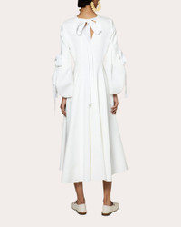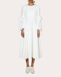 Cut from semi-structured crepe, the Calmina dress features a tea-length silhouette with a natural waistline seam that gives way to a softly pleated skirt. Decorative ribbon ties on the voluminous sleeves and back bodice create feminine appeal. Back tie closure Bardot fitted bodice Fitted waistline Pleated sleeves with bow details Woven bonded crepe Self: 60% acetate, 40% polyester Lining: 73% acetate, 27% silk Dry clean Made in China Size & Fit Model (wearing size UK 8): 5ft 10in tall Fits true to size Size UK 6 (US 0-2 / XS): 33.07in bust; 25.2in waist; 35.43in low hip; 24.31in arm length Size UK 8 (US 4 / S): 33.86in bust; 25.98in waist; 36.22in low hip; 24.41in arm length Size UK 10 (US 6 / S/M): 35.43in bust; 27.56in waist; 37.8in low hip; 24.76in arm length Size UK 12 (US 8 / M): 37.4in bust; 29.53in waist; 39.76in low hip; 24.76in arm length Size UK 14 (US 10 / M/L): 39.37in bust; 31.5in waist; 41.73in low hip; 24.96in arm length Size UK 16 (US 12 / L): 41.34in bust; 33.46in waist; 43.7in low hip; 25.16in arm length Please note, above measurements reflect Roksanda's size chart, not the actual garment.