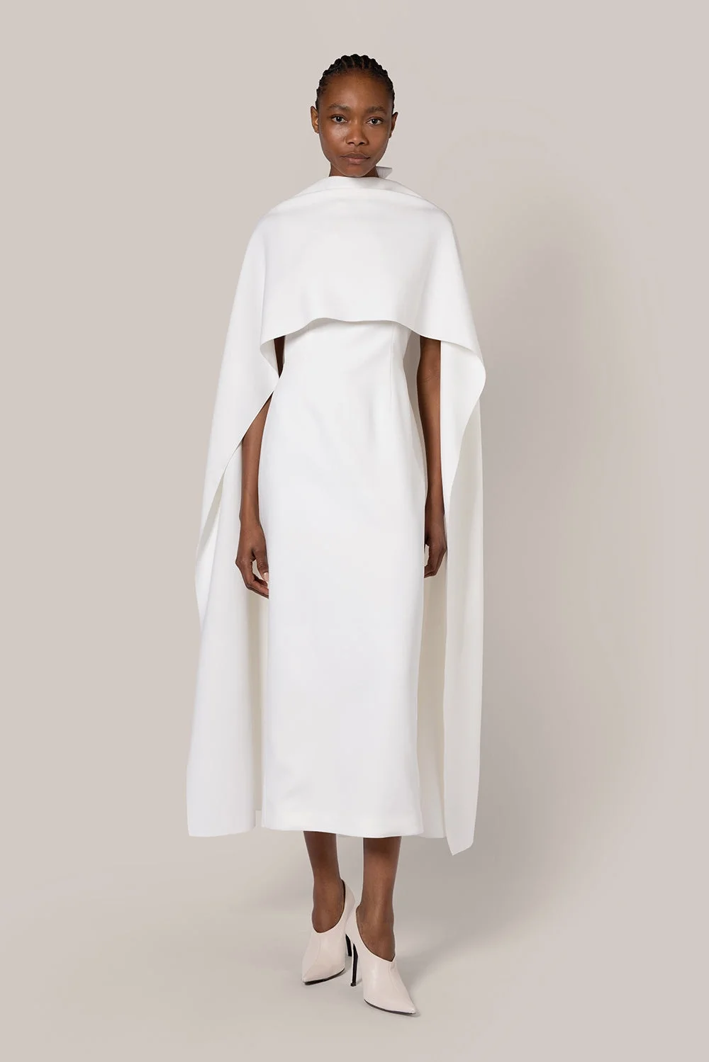 Architectural yet feminine, the ELINA dress in ivory is constructed from luxurious crepe and features an elegant cape that falls effortlessly towards the floor for a stunning sculptural mid length bridal silhouette. Model Wears: UK Size 8 Details & Care Main Colour: Ivory Product Composition: Crepe Product Care: Specialist Dry Clean
