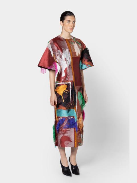 The FALAH dress features voluminous sleeves that add a bold, architectural flair to its sleek silhouette. This fitted mid length dress is crafted in abstract printed cotton. DETAILS & CARE Main Colour: Chalk Pictorial print Product Fabric: Printed cotton Product Composition: 100% Cotton, Lining: 100% Cotton Product Care: Specialist Dry Clean SIZING & FIT Model Wears: Size 8 Sizing System: UK Sizing