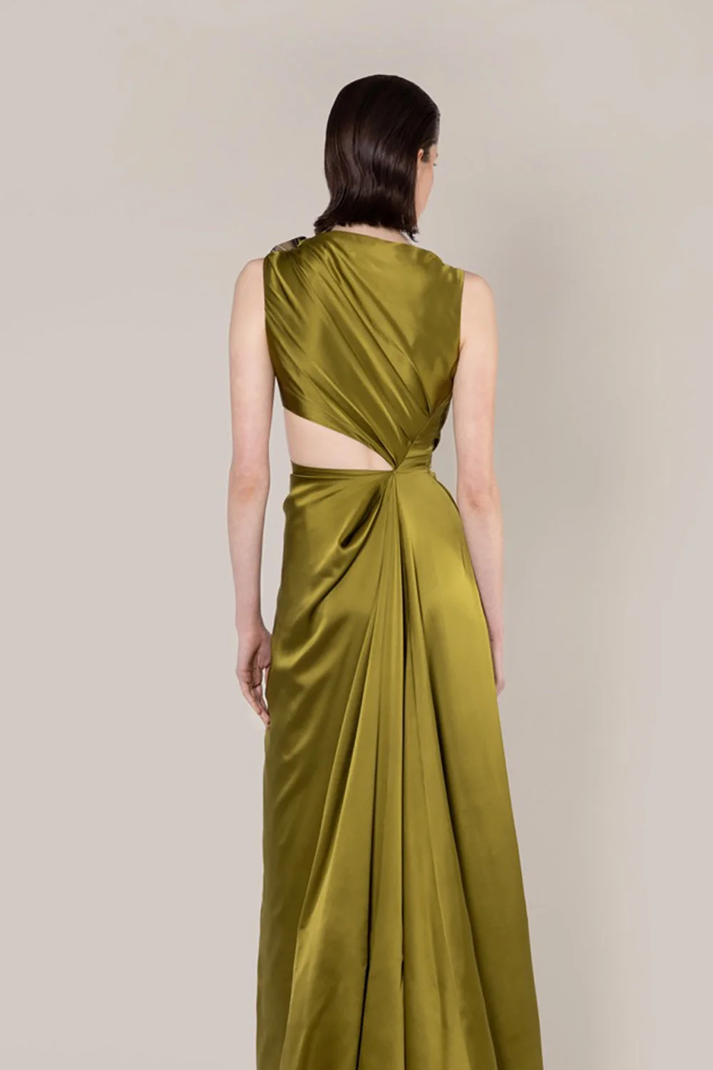 The FAUNA dress, a floor length gown crafted in silk. Silk drapes across the bodice, cinched to the waist with metalic fastenings. Model Wears: UK Size 8 Details & Care Main Colour: LIGHT MOSS Product Composition: Silk Product Care: Specialist Dry Clean