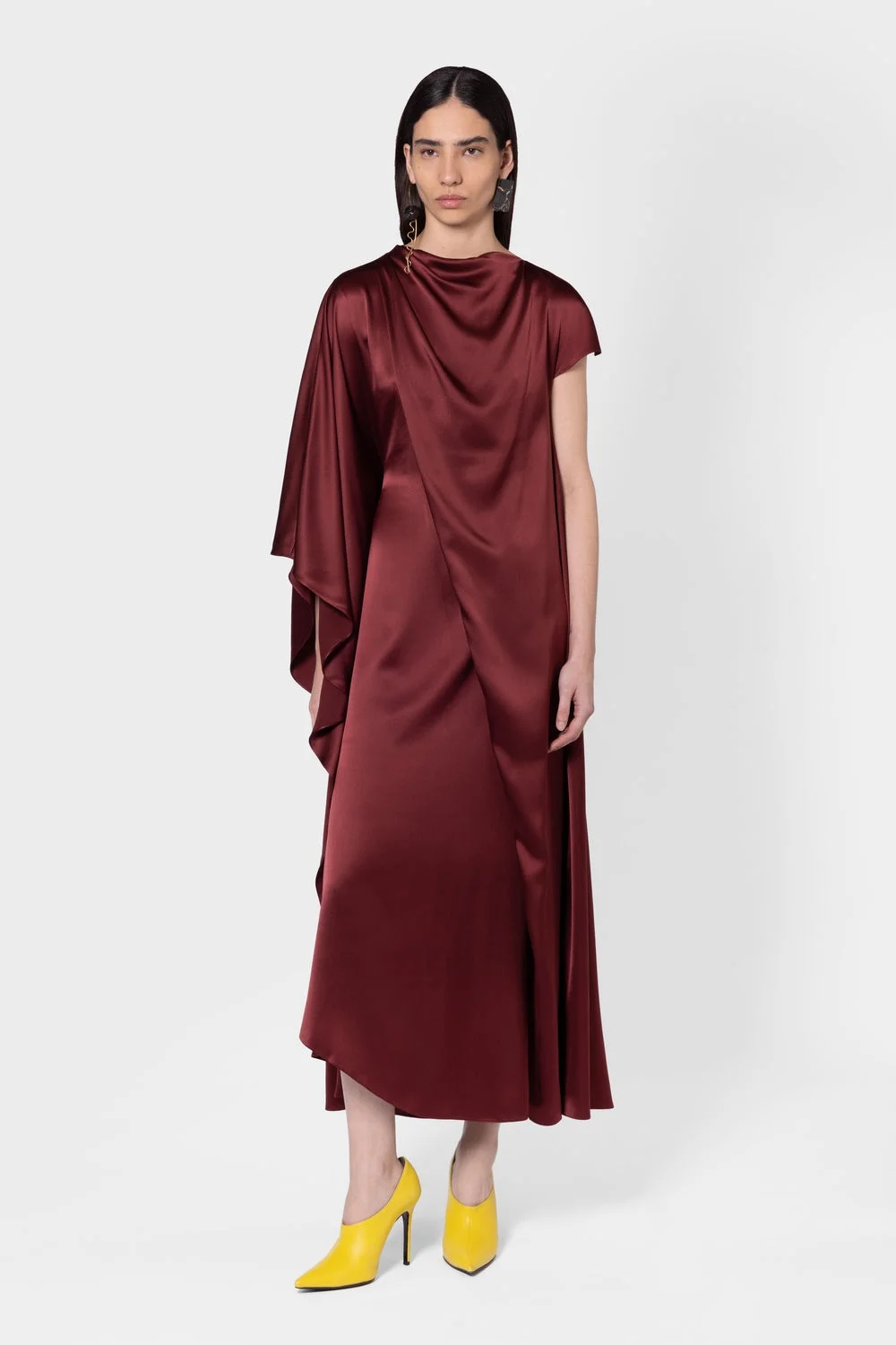 The HIBA dress in deep chestnut is an elegantly draped mid length silk dress with a-symmetric styling. A cap sleeve to one side is complimented by a contrasting draped cape sleeve to the other. Model Wears: UK Size 8 Details & Care Main Colour: Chestnut Product Fabric: Silk Satin Product Composition: 100% Silk Lining: 73% Acetate 27% Silk Product Care: Specialist Dry Clean