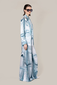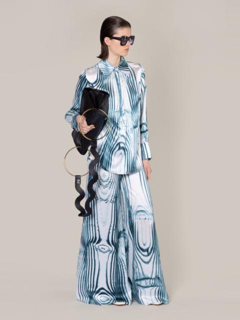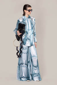 The JUNIPER top features a striking teal woodgrain pattern, creating a bold visual statement. Its relaxed silhouette, complete with a classic collar and long sleeves, blends effortless elegance with a contemporary edge. DETAILS & CARE Main Colour: Blue Product Composition: Silk Product Care: Specialist Dry Clean SIZING & FIT Model Wears: Size 8 Sizing System: UK Sizing