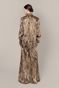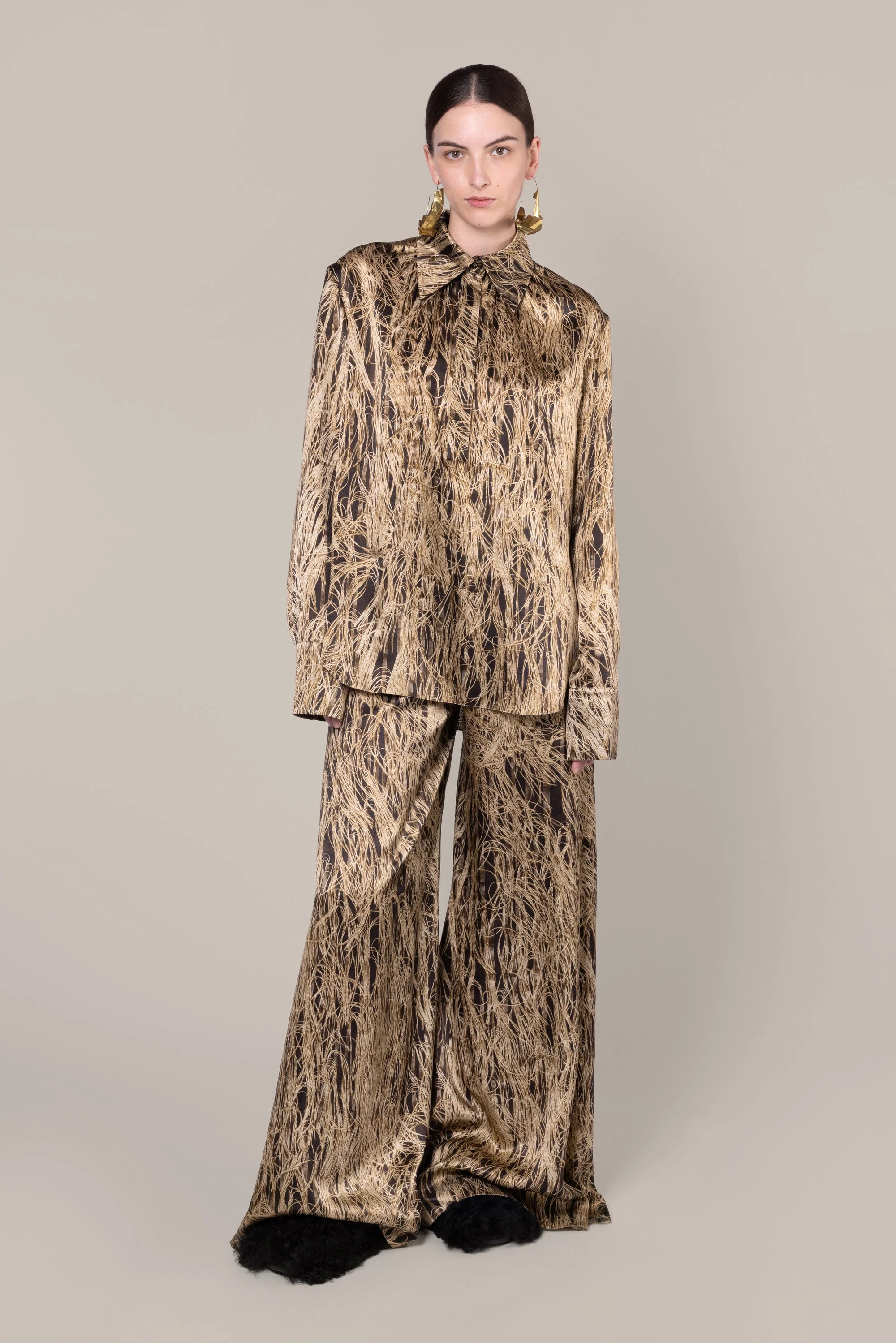 The JUNIPER top features a striking Gold feather pattern, creating a bold visual statement. Its relaxed silhouette, complete with a classic collar and long sleeves, blends effortless elegance with a contemporary edge. DETAILS & CARE Main Colour: Feather Gold Product Composition: Silk Product Care: Specialist Dry Clean SIZING & FIT Model Wears: Size 8 Sizing System: UK Sizing