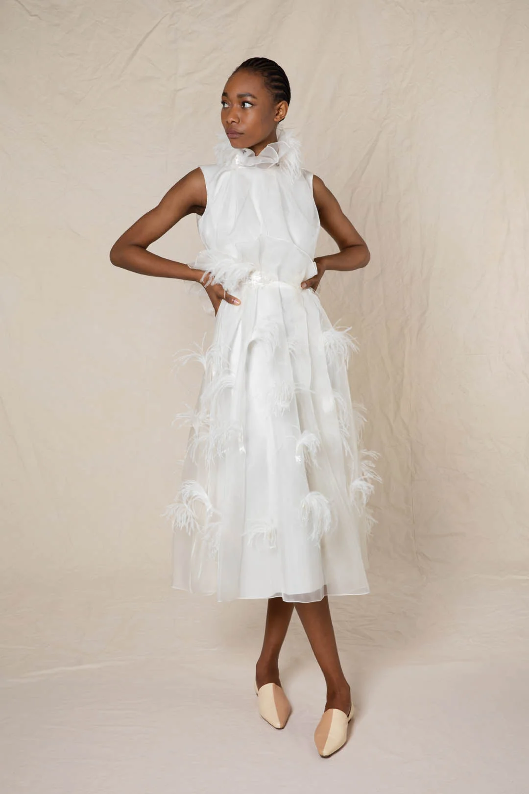 Carefully constructed from ivory silk organza, the KAREA dress is elegantly textured with beaded and feather embellishments. The sleeveless, fit and flare midi-length silhouette is complimented by a ruffled neckline and cinched waist. Model Wears: UK Size 8 Details & Care Colour: IVORY Product Composition: SELF: 100% SILK, LINING: 100% SILK Product Care: Specialist Dry Clean