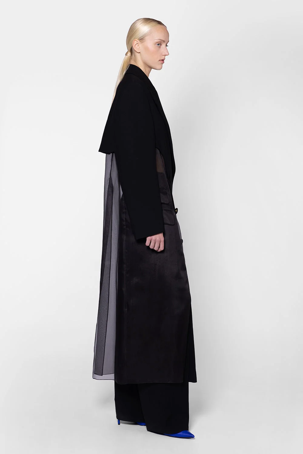 The KIFA coat is an elegant mid length coat with sheer organza cut out detailing. Model Wears: UK Size 8 Details & Care Main Colour: BLACK Product Composition: Crepe Product Care: Specialist Dry Clean