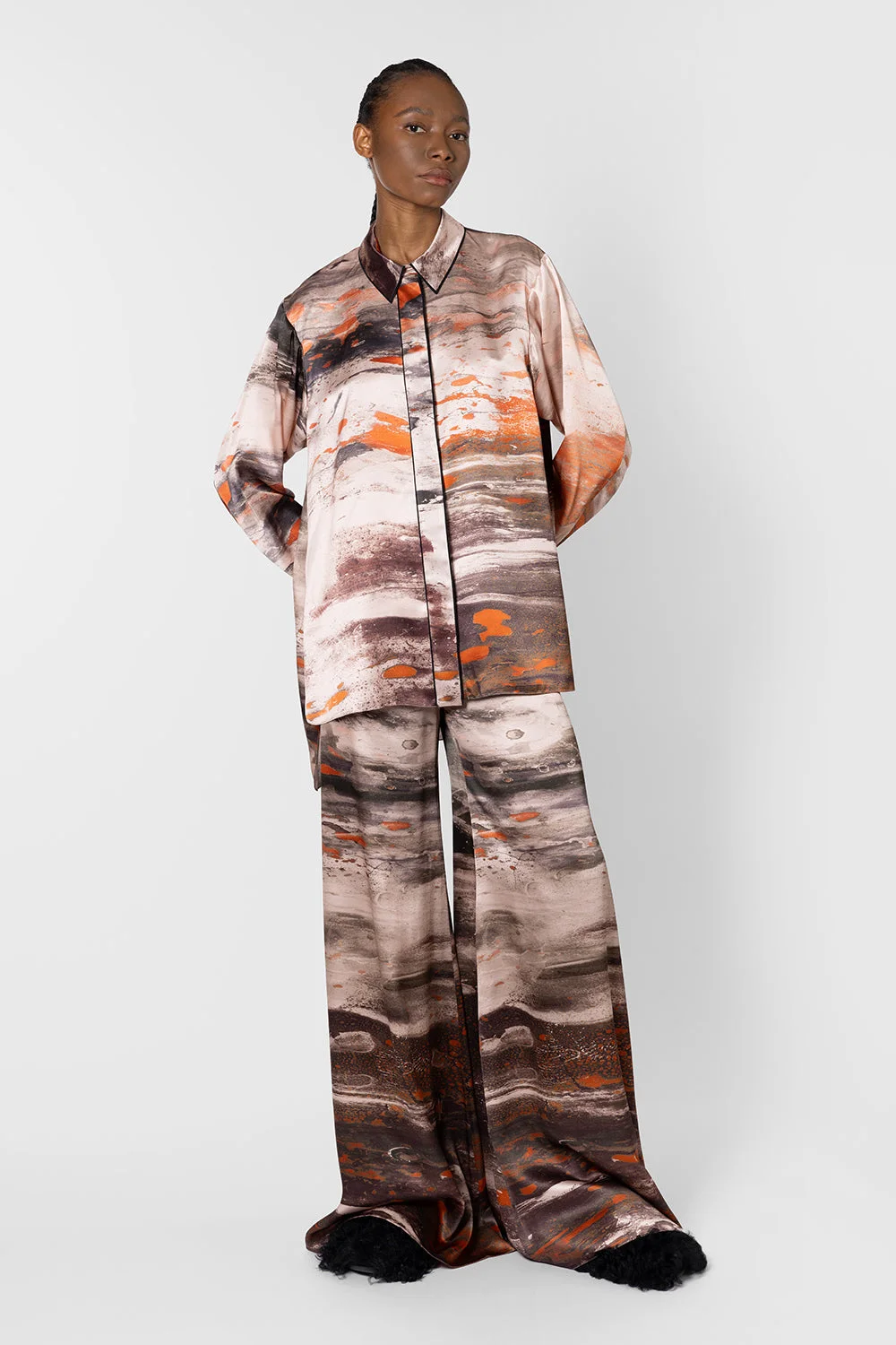Model Wears: UK Size 8 Details & Care Main Colour: BRUSH ORANGE / CINNAMON Product Fabric: PRINTED SILK SATIN Product Composition: 100% SILK Product Care: Specialist Dry Clean