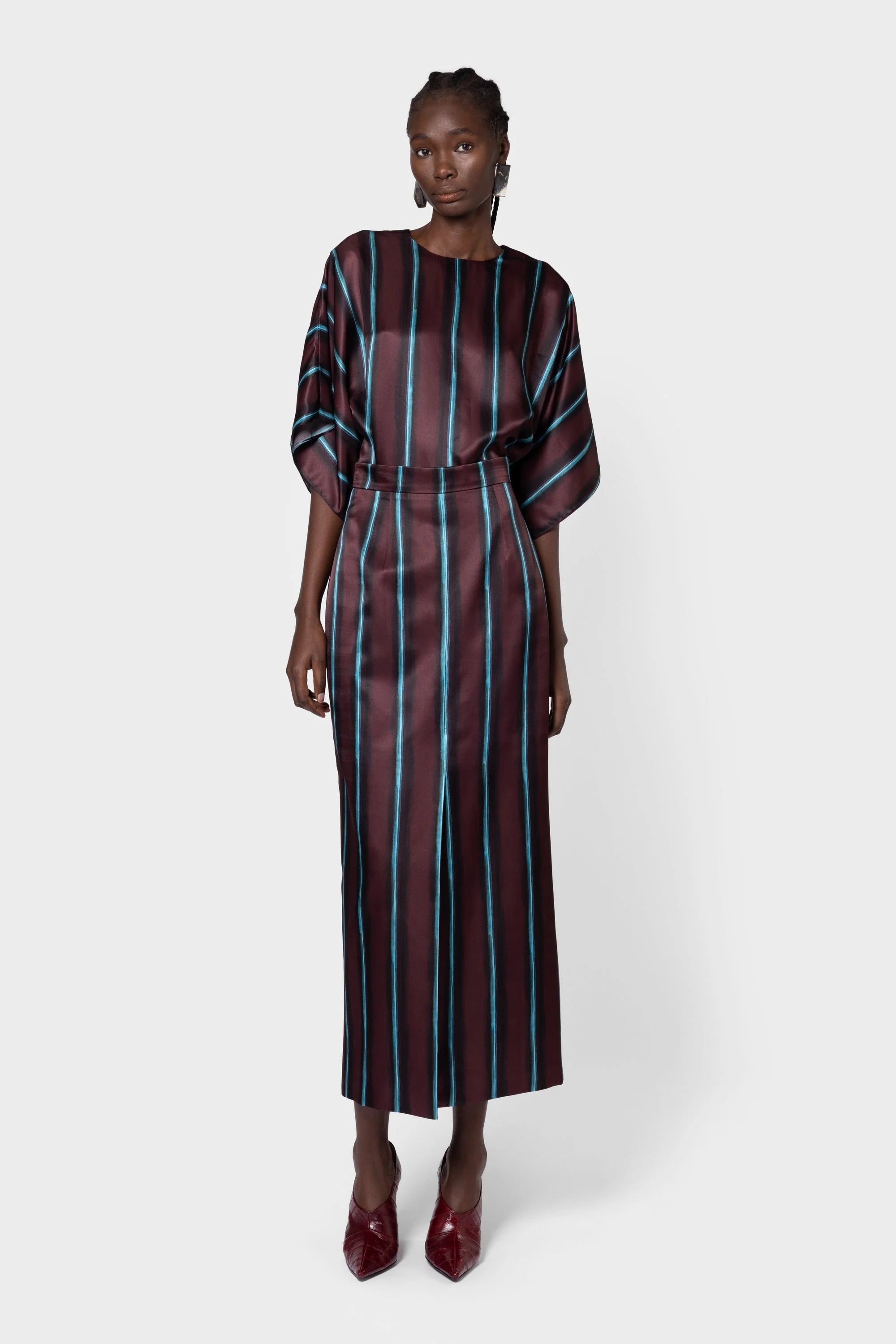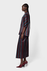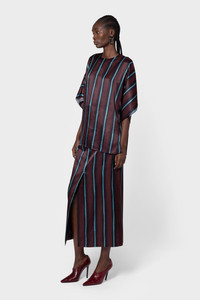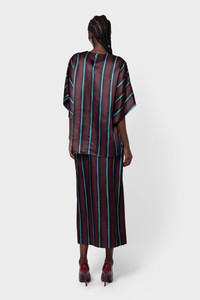 The NADRA top in flowing silk features a pop of aqua blue pinstripe throughout. This oversized silk t-shirt is best styled with the matching HUDA skirt or ARNEAU trouser. DETAILS & CARE Main Colour: Calliope and Aqua Product Fabric: Silk Satin Product Composition: 100% Silk Product Care: Specialist Dry Clean SIZING & FIT Model Wears: Size 8 Sizing System: UK Sizing