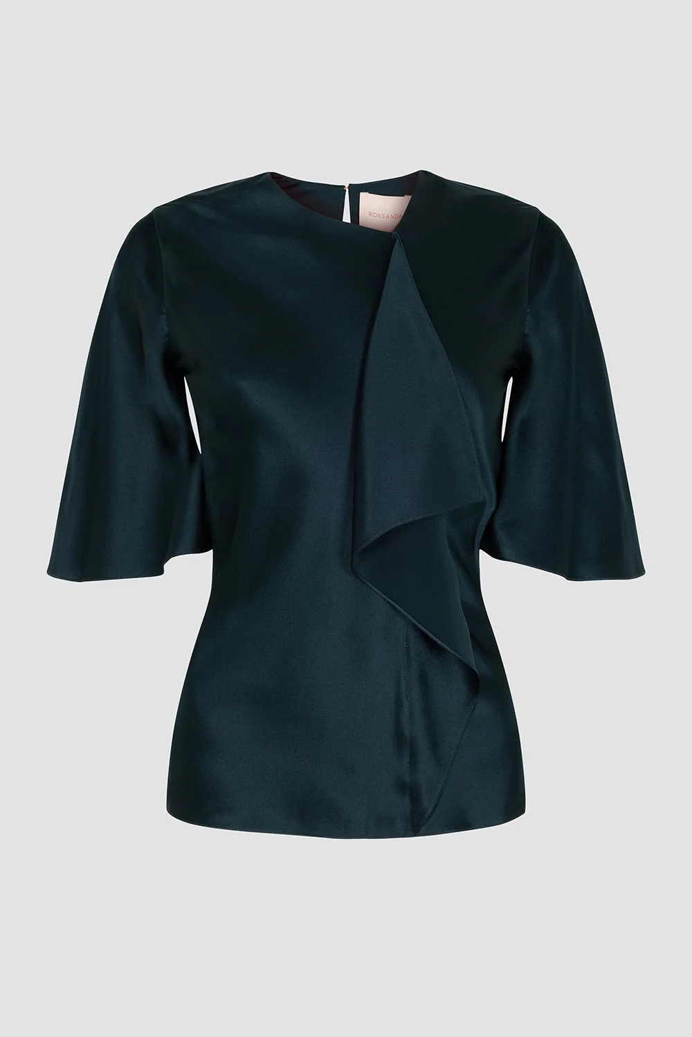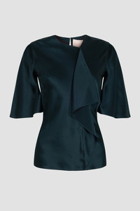 The NAIARA top is crafted from rich teal silk. It features a cascading asymmetric panel that adds dimension to its clean, structured silhouette. Its flowing short sleeves complement the tailored fit, making it a refined yet bold statement piece. Model Wears: UK Size 8 Details & Care Main Colour: DARK TEAL Product Fabric: Silk Sati Product Composition: 100% Silk Product Care: Specialist Dry Clean