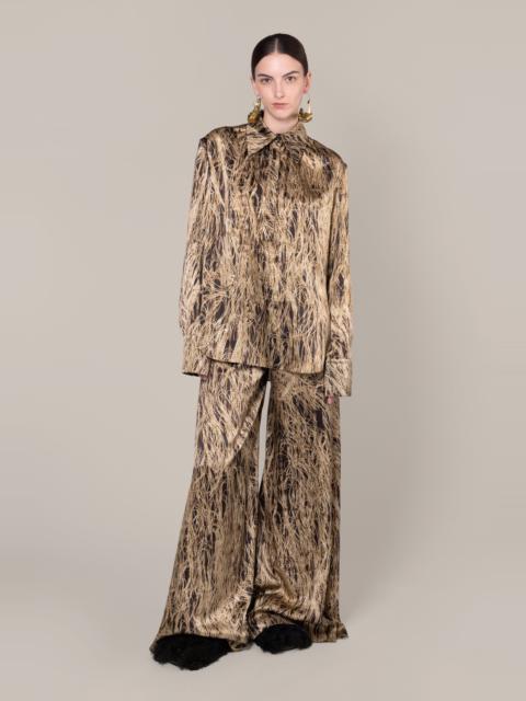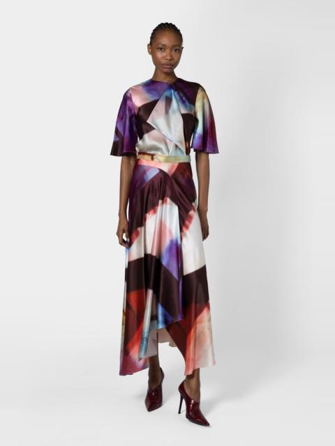 The NAIARA top is crafted from rich Satin Silk in multicoloured pattern. It features a cascading asymmetric panel that adds dimension to its clean, structured silhouette. Its flowing short sleeves complement the tailored fit, making it a refined yet bold statement piece. DETAILS & CARE Main Colour: Burgundy and Pink Photo Product Composition: Silk Product Care: Specialist Dry Clean SIZING & FIT Model Wears: Size 8 Sizing System: UK Sizing