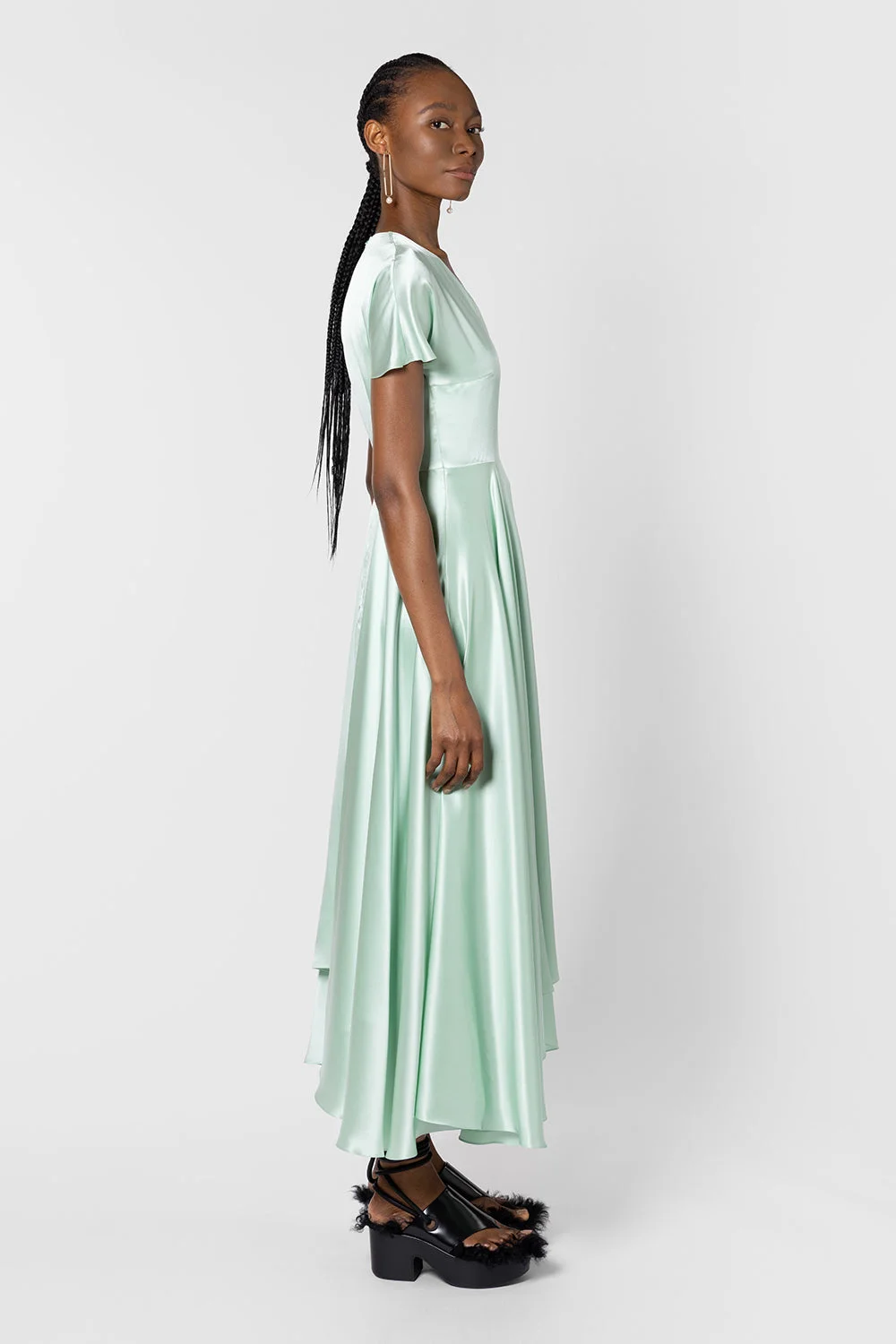 The NOMA Dress, a mid length silk dress in soft mint. A flattering fit and flare style, the fitted bodice features a cap sleeve and V neck with flowing skirts. Model Wears: UK Size 8 Details & Care Main Colour: OPALINE Product Fabric: SILK SATIN Product Composition: 100% SILK / 73% ACETATE 27% SILK Product Care: Specialist Dry Clean