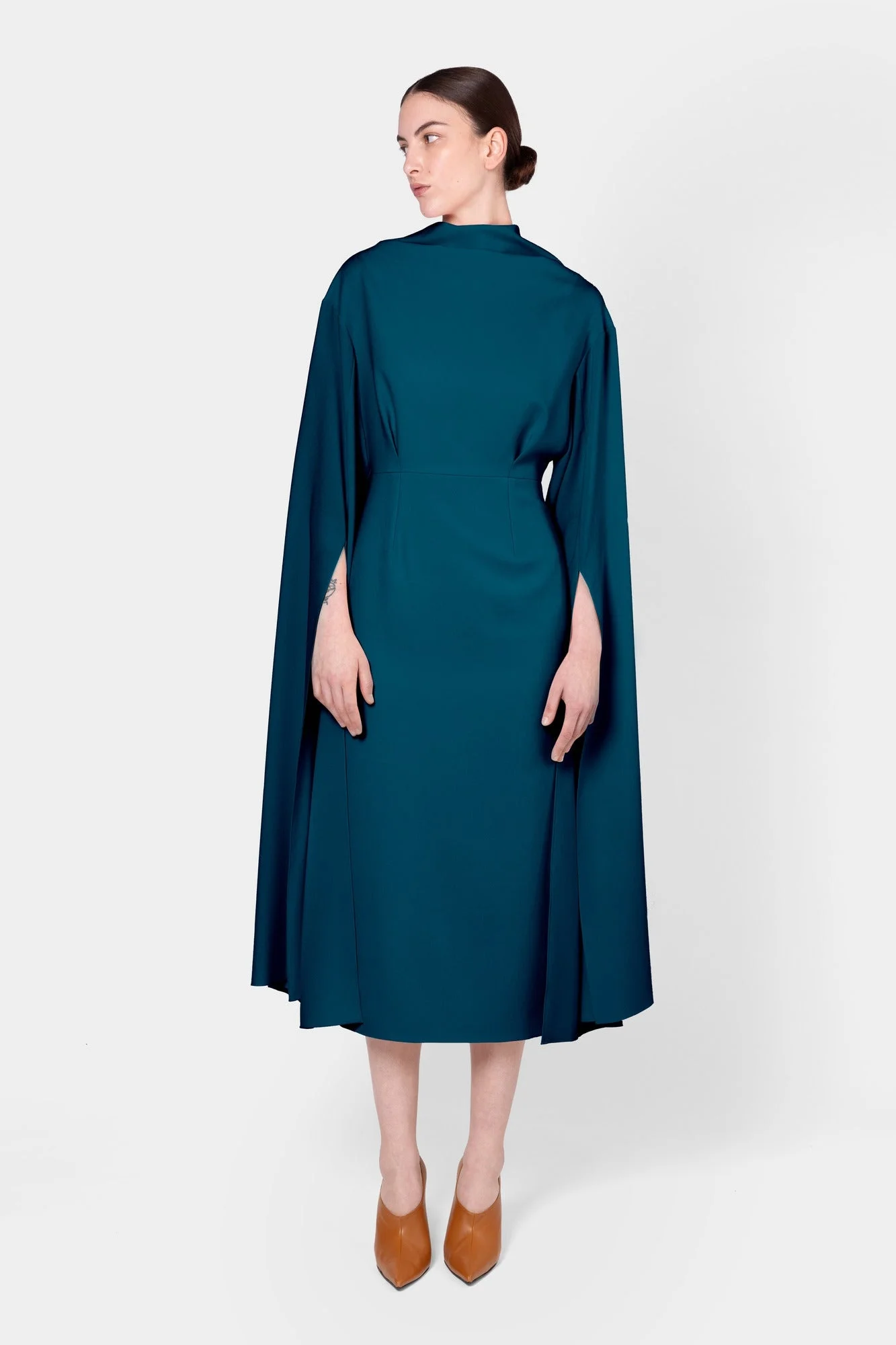 Form fitting and flattering, the NOUR dress in crepe features a high neckline with long draped sleeves. Its deep V neckline to the back offers sensual styling to the modest mid length. DETAILS & CARE Main Colour: Aegean Product Composition: Crepe Product Care: Specialist Dry Clean SIZING & FIT Model Wears: Size 8 Sizing System: UK Sizing