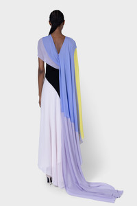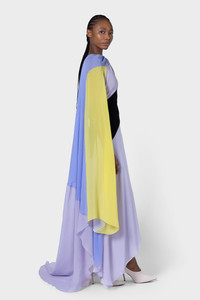 The OREL Dress is crafted in layers of silk crepe. Contrasting panels in hues of lilac and blue are punctuated with a pop of chartreuse, while the waist is defined by bold black. This floor length gown features gathered shoulder detail and an asymmetrical draped cape to the back. Model Wears: UK Size 8 Details & Care Main Colour: LILAC / BLACK / YELLOW Product Fabric: Crepe / Georgette Product Composition: 100% SILK, 68% ACETATE 32% POLYESTER, 73% ACETATE 27% SILK Product Care: Specialist Dry Clean
