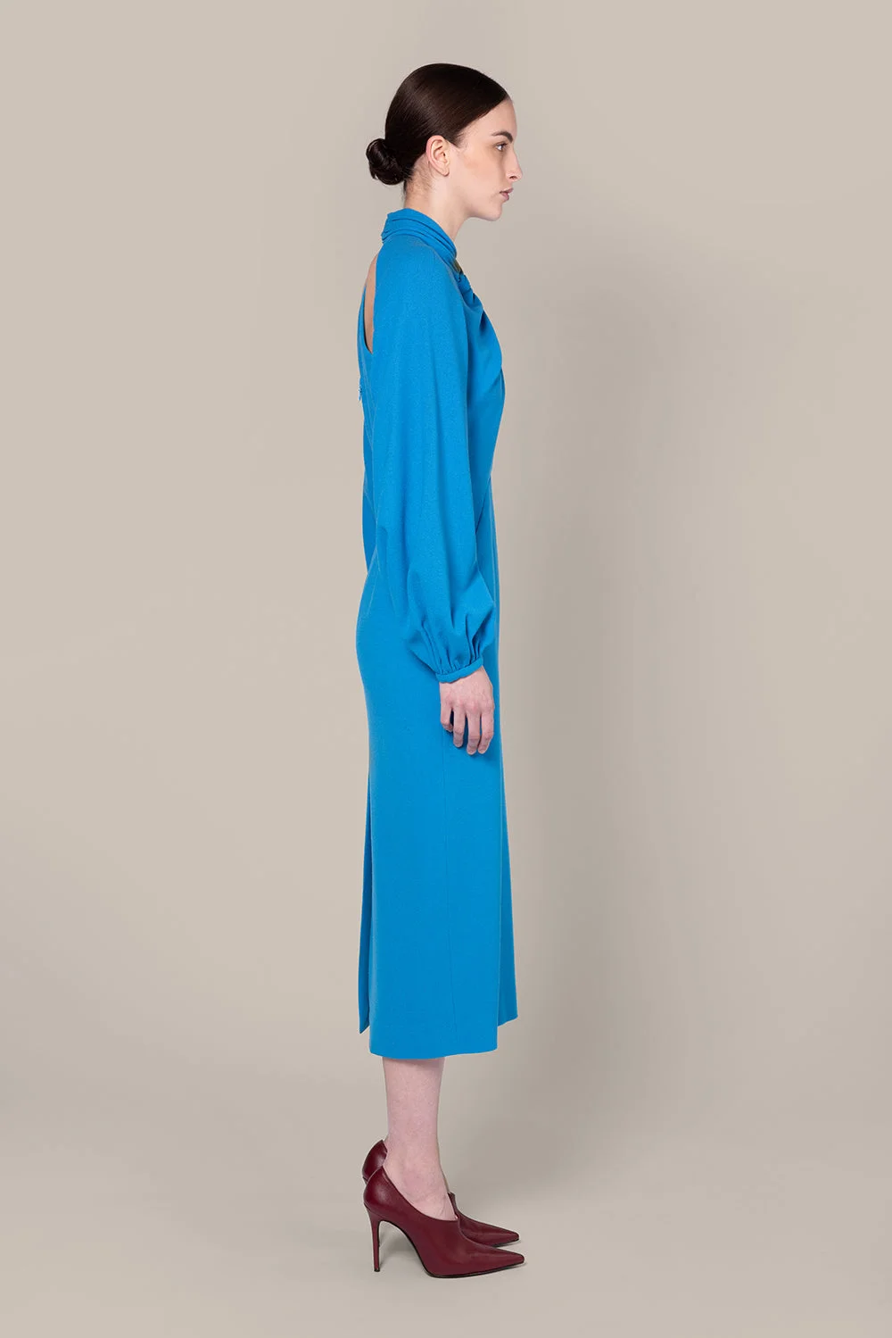 Form fitting and flattering, the NIMA dress in crepe features a high neckline with twist detailing, complimented by long sleeves. Sensual cut out detailing frames the shoulders. Model Wears: UK Size 8 Details & Care Main Colour: TURQUIOSE Product Composition: Crepe Product Care: Specialist Dry Clean