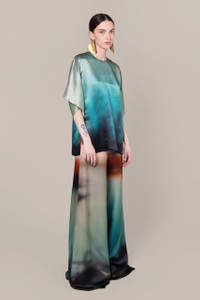 The VERSALA top features a mesmerizing sunset pattern in teal, creating a flowing visual effect. Its relaxed silhouette and lightweight fabric add effortless elegance to this unique piece. DETAILS & CARE Main Colour: Sunset Teal Product Composition: Silk Product Care: Specialist Dry Clean SIZING & FIT Model Wears: Size 8 Sizing System: UK Sizing