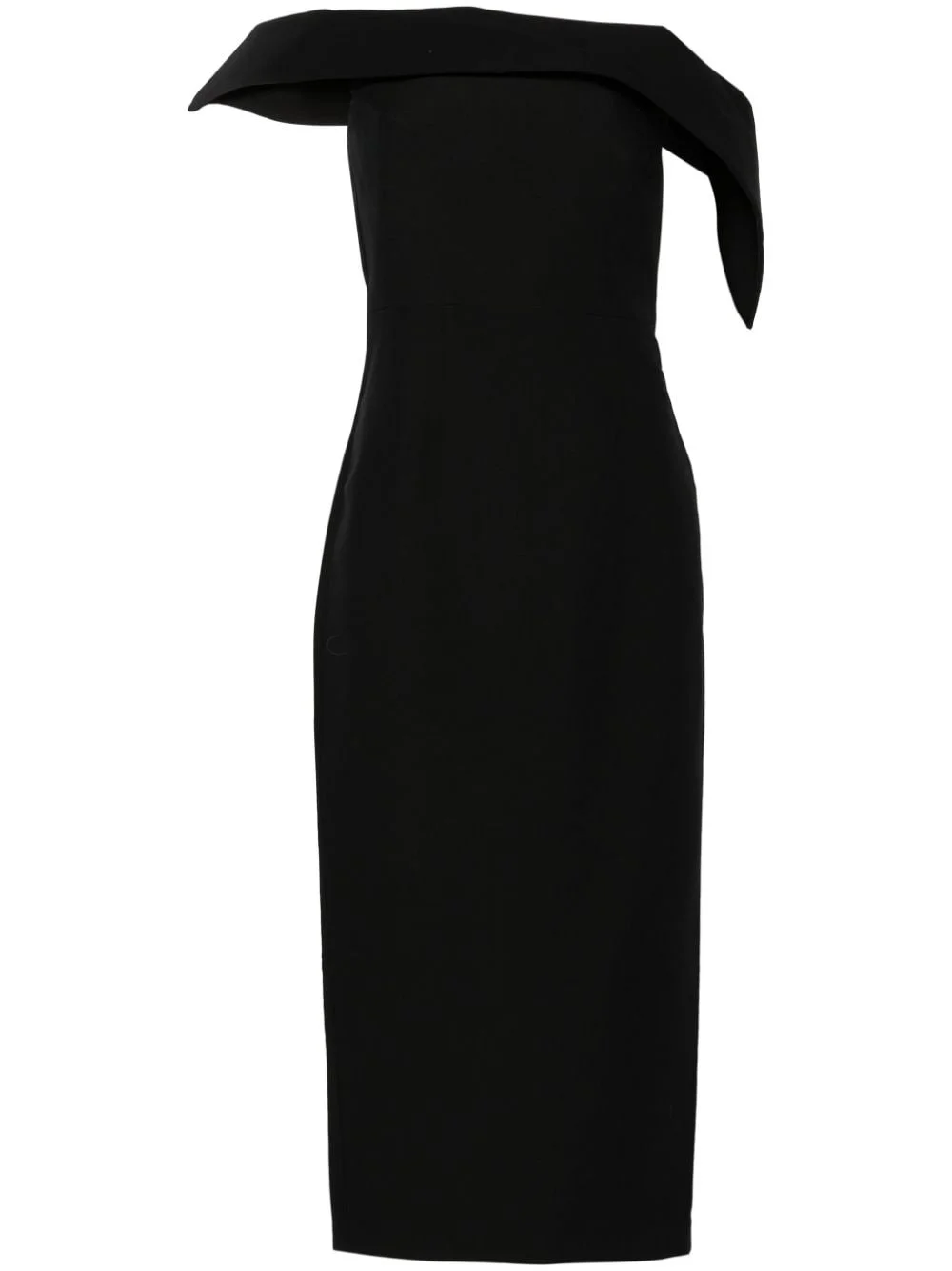 off-shoulder crepe midi dress Highlights - Black - Wool-silk blend - Crepe texture - Draped detailing - Off-shoulder - Rear zip fastening - Fitted waistline - Pencil silhouette - Rear slit - Straight hem - Mid-calf length Imported Composition Outer: Silk 100%, Polyester 100%, Wool 70% Lining: Polyester 100% SIZE & FIT Model measurements Height 5 ft 11 in(1.8 m) Bust/Chest 33.07 in(84 cm) Hips 37.4 in(95 cm) Waist 25.19 in(64 cm) Measurement HIPS 39.37 in(100 cm) LENGTH 49.6 in(126 cm) WAIST 28.34 in(72 cm) FittingInformation Designed for a slim fit that sits just away from the body offering a close yet comfortable fit The internal bodice offers support and shape Made from a midweight non-stretch fabric This piece fits true to size – take your usual size Washing instructions Dry Clean Only