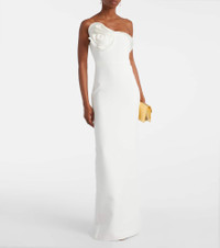 Roland Mouret quickly made a name for itself through a black tie-ready aesthetic and an expert use of draping. This one-shoulder maxi dress is crafted from crepe and is topped with a floral applique. Product Details - Material: 84% polyester, 11% viscose, 5% elastane - Care instructions: dry clean - Made in China - Designer color name: White - Item color: white - Lining: 95% viscose, 5% elastane - Lining II: 84% polyester, 16% elastane - Built-in bustier - Closure: zipped back - Short vent - Item number: P01080433 Size & Fit - True to size - Close fit at the hips - Strapless - Internal boned corset for support - Fitted - Non-stretchy fabric - slit length 69cm-27" - The model seen in the picture is 178cm-5'10" and wearing a size UK 6